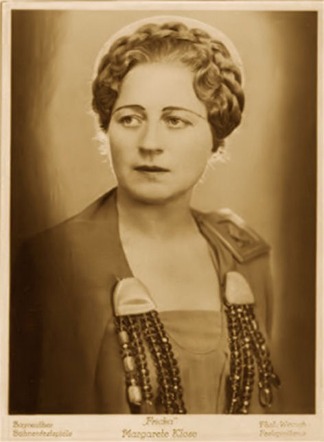 Klose, Margarete, Alt, * 6.8.1899 Berlin, † 14.12.1968 Berlin; eigentlicher Name Frida Klose. Sie ergriff zuerst einen praktischen Beruf, ließ dann aber ihre Stimme am Klindworth-Scharwenka- Konservatorium, u.a. bei Franz Marschalk, in Berlin ausbilden. Sie studierte auch bei dem Berliner Pädagogen Walter Bültemann (1879- 1949), den sie heiratete. Bühnendebüt 1927 am Stadttheater von Ulm als Manja in E. Kálmáns Operette »Gräfin Mariza«. 1928-29 war sie am Staatstheater von Kassel, dann bis 1931 am Nationaltheater von Mannheim engagiert. Sie wirkte bereits 1929 bei den Wagner-Festspielen im Théâtre des Champs- Élysées in Paris unter F. von Hoesslin