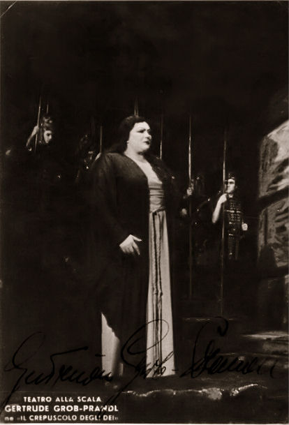 Grob-Prandl, Gertrude, Sopran, * 11.11.1917 Wien, 16.5.1995 Wien; sie studierte an der Wiener Musikakademie bei Frau Singer- Burian und debütierte 1940 an der Wiener Volksoper, an der sie sechs Jahre lang blieb, als Santuzza in »Cavalleria rusticana«. Sie sang dort u.a. die Amelia in Verdis »Maskenball«, die Elisabetta in dessen »Don Carlos«, die Aida, die Tosca und die Titelfigur in »Ariadne auf Naxos« von R. Strauss. 1943 gastierte sie an den Staatsopern von Dresden und München. 1945-47 war sie am Stadttheater von Zürich engagiert, 1945 wurde sie an die Wiener Staatsoper berufen (Antrittsrolle: Tosca), an der sie bis 1972 auftrat und zu bedeutenden Erfolgen kam, u.a. als Martha in »Tiefland« von E. d'Albert, als Donna Anna im »Don Giovanni«, als Rosalinde in der »Fledermaus« und vor allem in ihren Wagner-Partien. Sie gastierte an der Mailänder Scala (1951 als Isolde im »Tristan«) und an der Oper von Rom, beim Maggio musicale Florenz, an der Covent Garden Oper London (1951 als Turandot von Puccini) und am Teatro San Carlo Neapel, am Teatro Colón Buenos Aires und am Teatro Liceo Barcelona. 1949 sang sie bei den Festspielen von Salzburg die 1. Dame in der »Zauberflöte«. Seit 1954 war sie der Berliner Staatsoper als erste dramatische Sopranistin verbunden, trat aber gleichzeitig auch in Wien auf. . Man hörte sie an an der Staatsoper allein 50mal als Leonore im »Fidelio«, oft auch als Ortrud im »Lohengrin«, als Senta im »Fliegenden Holländer«, als Amelia im »Maskenball« von Verdi und als Turandot von Puccini. An der Mailänder Scala sang sie 1954 in der »Götterdämmerung«, 1951 am Teatro San Carlo Neapel, 1950 am Teatro Colón Buenos Aires (im Nibelungenring), 1950-54 am Teatro Liceo Barcelona, 1958 beim Maggio musicale Florenz (Turandot), 1953 an der Oper von Rom (Brünnhilde im Ring-Zyklus), 1954 und 1956 bei den Festspielen in den römischen Thermen des Caracalla (Turandot). An der Grand Opéra Paris war sie 1953 als Isolde, 1962 in der »Götterdämmerung«, am Théâtre de la Monnaie Brüssel 1954, am Teatro Massimo Palermo 1954, am Teatro Fenice Venedig 1953, am Opernhaus von Bordeaux 1954 (Nibelungenring), am Teatro Comunale Bologna 1952 (Brünnhilde im »Siegfried«) und 1953 (Isolde), am Teatro Verdi Triest 1953, am Teatro Carlo Felice Genua 1959 (Santuzza in »Cavalleria rusticana«) anzutreffen. 1953 war sie an der Oper von San Francisco, 1954 bei den Festspielen in der Arena von Verona zu Gast. In den Jahren 1961-64 bestand auch ein Gastvertrag mit der Hamburger Staatsoper. Sie hat allein die Titelpartie in Puccinis »Turandot« über hundertmal gesungen. 1972 gab sie ihre Karriere auf (als Venus im »Tannhäuser« nahm sie von der Bühne Abschied). - Groß dimensionierte, dramatische Sopranstimme, die zumal im Wagner-Repertoire geschätzt wurde. Auf Nixa sang sie die Donna Anna in einer vollständigen Aufnahme des »Don Giovanni«, auf Remington die Titelrolle in Puccinis »Turandot«, auf Cetra erschien eine Arien-Platte sowie eine vollständige »Tristan«-Aufnahme mit der Sängerin als Isolde und Max Lorenz als Tristan, auf Discocorp »Zauberflöte« (Mitschnitt aus Salzburg, 1949). |