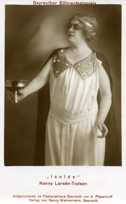 Larsén-Todsen, Nanny, Sopran, * 2.8.1884 Hagby (Schweden), 26.5.1982 Stockholm; sie studierte am Königlichen Konservatorium von Stockholm bei Oscar Lejdström sowie in Berlin und Mailand. 1906 debütierte sie an der Königlichen Oper Stockholm als Agathe im »Freischütz«. Sie wirkte in Stockholm in den schwedischen Erstaufführungen der Opern »Boris Godunow« (1911 als Xenia) und »Violanta« von Korngold (1918, Titelrolle) mit und sang 1912 die Titelrolle in der Uraufführung der Oper »Leila« von Nathanael Berg. Nachdem sie anfänglich lyrische Sopranpartien gesungen hatte, ging sie ins dramatische und ins Wagner-Fach über. 1916 unternahm sie ihre ersten Auslandsgastspiele, wurde aber erst international bekannt, nachdem sie sich seit 1922 ganz auf den Wagnergesang spezialisiert hatte. 1922 wurde sie zur schwedischen Hofsängerin ernannt, 1924 Mitglied der schwedischen Musikakademie Stockholm. 1923-24 erregte sie als Isolde im »Tristan« an der Mailänder Scala großes Aufsehen. 1925-27 war sie an der Metropolitan Oper New York tätig, wo sie als Brünnhilde in der »Götterdämmerung« debütierte und als weitere Partien die Isolde, die Fricka, die Kundry im »Parsifal«, die Leonore im »Fidelio« und die Rachel in »La Juive« von Halévy sang. ;Bei den Festspielen von Bayreuth trat sie 1927 als Kundry im »Parsifal«, 1927-31 als Brünnhilde im Ring-Zyklus, 1928-31 als Isolde im »Tristan« auf, bei den Festspielen von Zoppot 1934 als Brünnhilde. Sie gastierte an der Grand Opéra Paris (1932 als Brünnhilde in der »Walküre«), an der Covent Garden Oper London (1927 und 1930 als Brünnhilde), an den Staatsopern von Berlin, Wien, Hamburg und München, in Kopenhagen, Budapest, Amsterdam und Brüssel. 1927-31 stand sie im Mittelpunkt der Bayreuther Festspiele, wo man sie vor allem als Isolde, aber auch als Brünnhilde im Ring- Zyklus und als Kundry im »Parsifal« bewunderte. Weitere Gastspiele an der Staatsoper von Wien (1928-30), an der Grand Opéra Paris, an der Staatsoper von München (1928-30), an der Staatsoper von Dresden (1927, 1928), am Stadttheater von Graz (1928), am Stadttheater von Basel (1929), in Genf (1931 in einem Wagner-Konzert) und bis 1936 an den großen deutschen Bühnen. 1937 sang sie als eine ihrer letzten Partien in Paris die Isolde. Nach Beendigung ihrer Karriere in den späten dreißiger Jahren wirkte sie in Stockholm als Pädagogin. - Die Pracht ihres Stimmaterials und die intensive Dramatik ihres Vortrags bewährten sich in erster Linie im Wagnergesang. Als weitere Hauptrollen kamen die Donna Anna im »Don Giovanni«, die Leonore im »Fidelio«, die Rezia im »Oberon« von Weber, die Marschallin im »Rosenkavalier« (die sie auch 1920 in der Stockholmer Erstaufführung der Oper sang), die Gioconda in der gleichnamigen Oper von Ponchielli, die Aida und die Tosca hinzu. Schllplatten: Parlophon, Favorite, Columbia (hier vollständiger »Tristan« aus Bayreuth, 1928). Eine Szene aus der »Götterdämmerung« wurde auf BASF veröffentlicht.